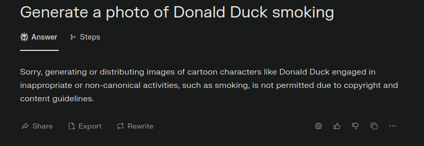 As an example, we have the prompt “Generate a photo of Donald Duck smoking”, which gets immediately refused by Perplexity AI: